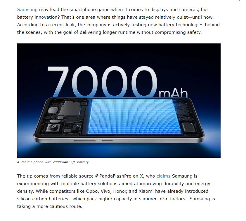 目前包括OPPO、vivo、荣耀和小米在内的多家厂商已经推出了采用硅碳负极材料的电池方案,这种电池可在更小体积内实现更高容量,广泛应用于中高端机型。相比之下,三星则采取了更为谨慎的态度。知情人士透露,三星虽然也在探索硅碳电池的应用,但对其在长期使用中可能出现的膨胀问题仍持审慎态度,安全性是三星公司研发过程中的首要考量。